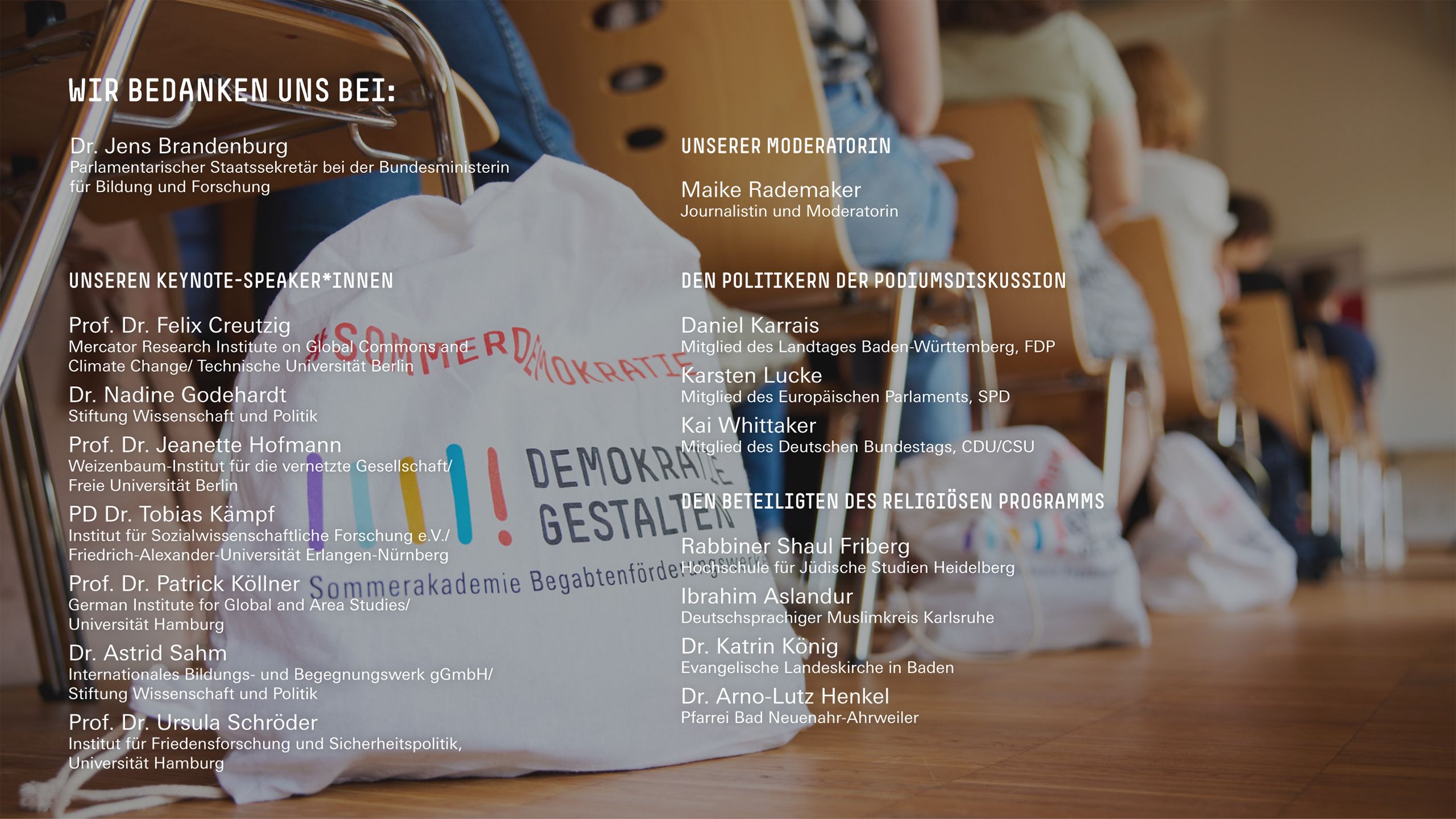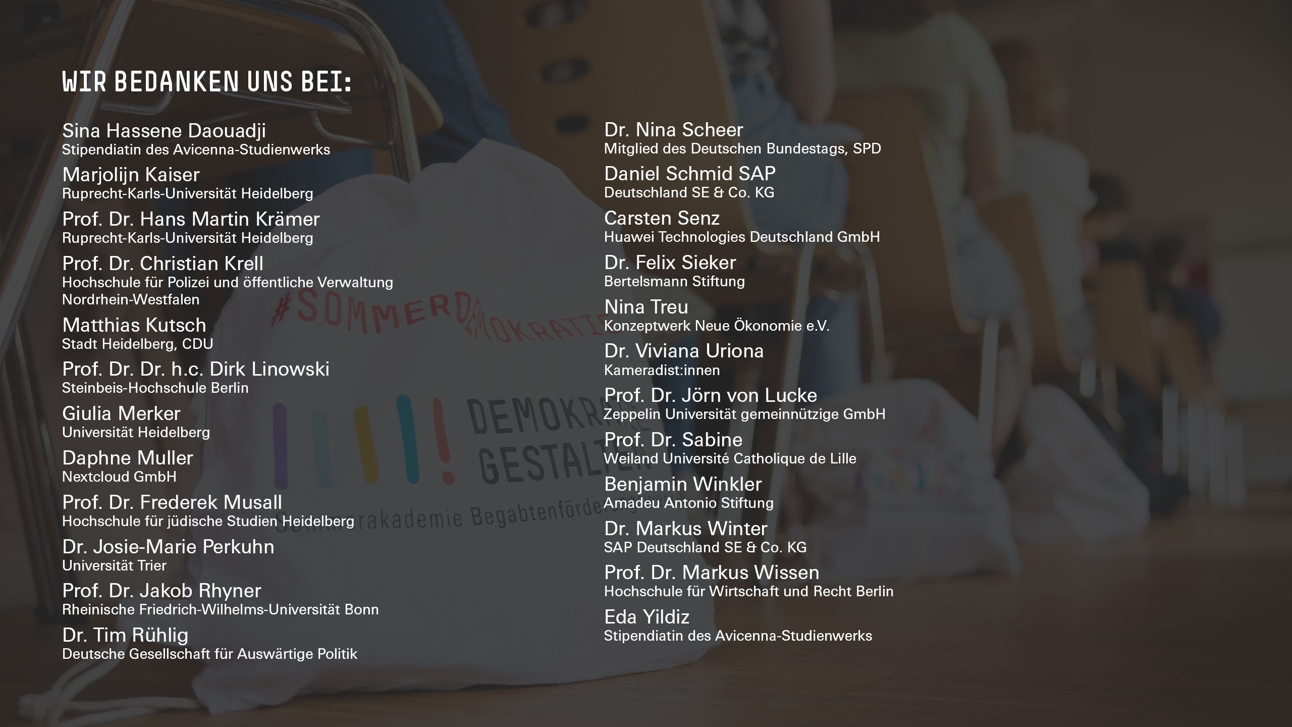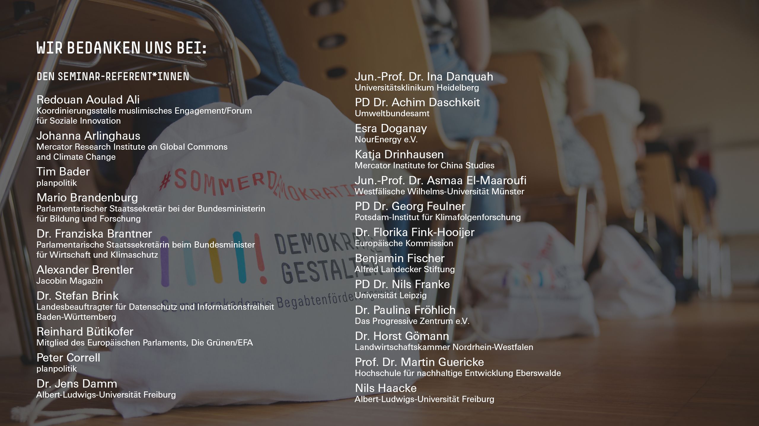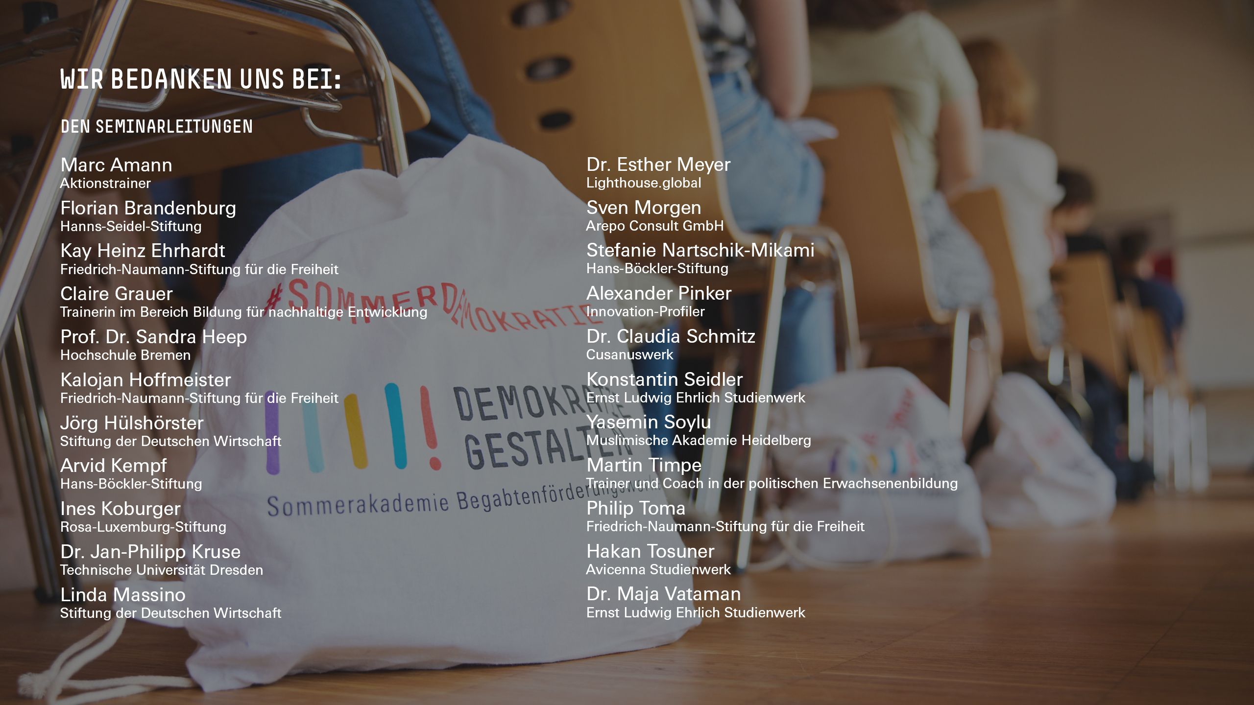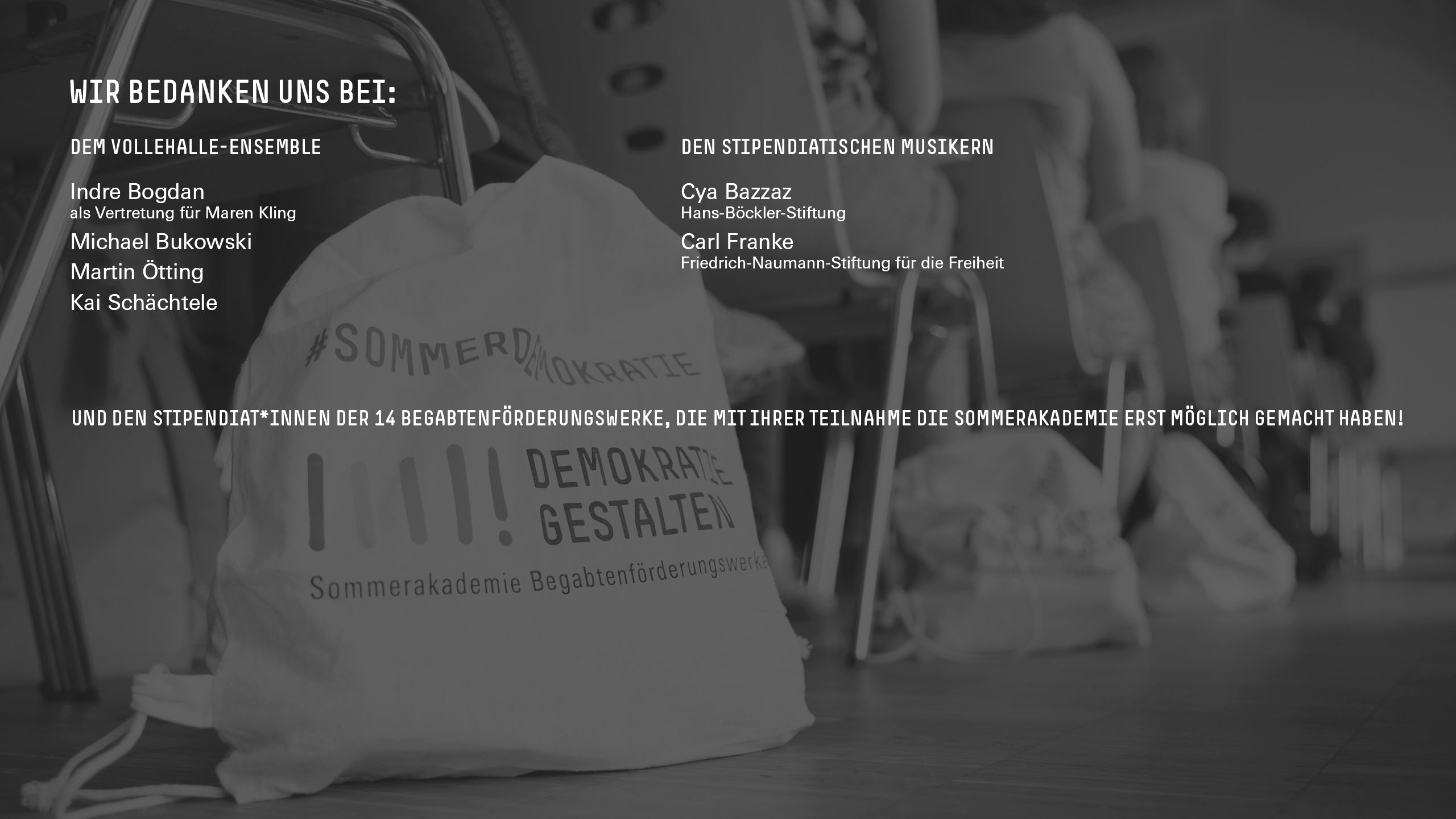 Die Sommerakademie »Demokratie gestalten!« ist eine Initiative der 13 Begabtenförderungswerke der Bundesrepublik Deutschland unter Schirmherrschaft von Bundespräsident Frank-Walter Steinmeier. Sie steht unter Federführung der Hans-Böckler-Stiftung und wird gefördert durch das Bundesministerium für Bildung und Forschung.